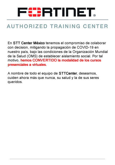 1.Configuración del sistema y de la red 2.Políticas de Firewall y NAT 3.Ruteo 4.Autenticación de Firewall 5.Fortinet Single Sign-On (FSSO) 6.Certificado de Operaciones 7.Antivirus 8.Filtrado Web 9.Prevención de Intrusos and Control de Aplicaciones 10.SSLVPN 11.IPsec VPN 12.Configuración y Monitoreo de SD-WAN 13.Security Fabric 14.Alta Disponibilidad 15.Diagnóstico y Troubleshooting